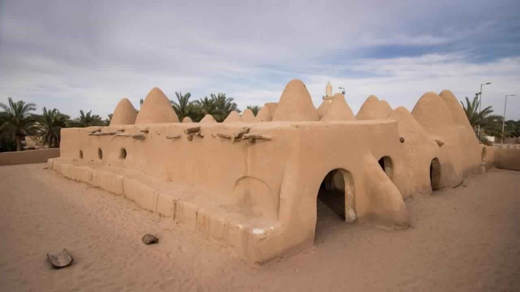 ينقسم إلى خمسة أروقة مقسمة من الوسط بعدد من الأعمدة المتلاصقة وبمجموعة أقواس تحمل القباب الّتي يبلغ عددها العشرين، وهذه القِباب المدبّبة مهمّتها تشتيت أشعة الشّمس المنعكسة على السّطـح و مياه الأمطار في فصل الشتاء، كما تساعد على تجميع أكبر قدر من الهواء البارد في تجويف القبّة من الداخل، و تمنع تجمَع مياه الأمطار على السطح نظرًا إلى شكلها المخروطي الذي يحول دون استقرار المياه والحفاظ على سقف المسجد من الانهيار أو تسرب المياه دخل المسجد وبناء المسجد على هيئــة شبـه مستطيـل منفرج الزوايا طوله 24 مترا وعرضه 19 مترًا ويُحيط به على جهاتــه الأربع فناء عرضـه 4 أمتار تقريباً.