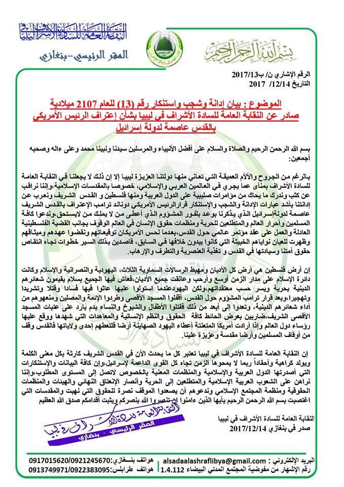 وقالت النقابة في بيانها أنّه “بالرغم من الجروح والألأم العميقة التي تعاني منها دولتنا العزيزة ليبيا إلا إن ذلك لا يجعلنا في النقابة العامة للسادة الأشراف بمنأى عما يجري في العالمين العربي والإسلامي، خصوصا بالمقدسات الإسلامية،وإننا نراقب عن كثب وندرك ما يحاك من مؤامرات صليبية على الدول العربية ومنها فلسطين و القدس الشريف ونعرب عن إدانتنا بأشد عبارات الإدانة والشجب والإستنكار قرارالرئيس الأمريكي دونالد ترامب الإعتراف بالقدس الشريف عاصمة لدولةإسرائيل الذي يذكرنا بوعد بلفور المشؤوم الذي أعطى من لا يملك من لايستحق،وندعوا كافة المسلمين وأحرار العالم والمتطلعين للحرية ومنظمات حقوق الإنسان في العالم الوقوف بجانب القضية الفلسطينية العادلة والعمل على عقد مؤتمر عالمي حول القدس،بعدما لحس الأمريكان توقيعاتهم ونقضوا عهدهم وميثاقهم وظهرت للعيان نواياهم الخبيثة التي كانوا يبدون خلافها في السابق، قاصدين بذلك السير خطوات تجاه انتقاص حقوق أمتنا وسيادتها في القدس و تغذية العنصرية والتطرف والإرهاب”.