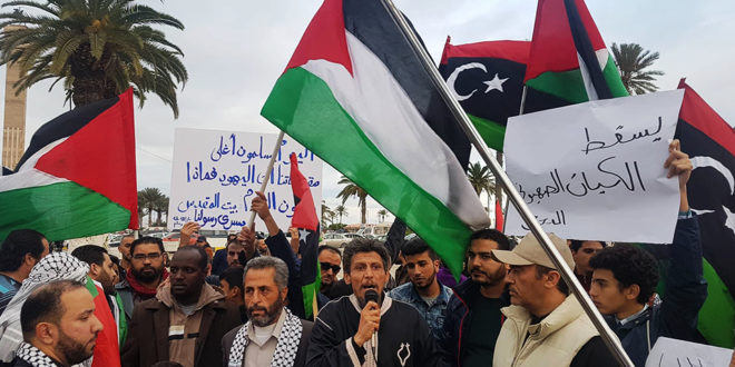 وشهد ميدان الشهداء بالعاصمة الليبية طرابلس مظاهرة حاشدة دعت إليها مؤسسات المجتمع المدني والجالية الفلسطينية المقيمة في ليبيا احتجاجاً على اعتراف الرئيس الأمريكي دونالد ترامب بالقدس عاصمة لـ”اسرائيل”واستنكاراً للصمت العربي والإسلامي وتواطوء بعض الدول العربية وخاصة الدويلات الخليجية على قضية فلسطين تحت مسمى صفقة القرن التي سوف يخسرون بها أراضيهم قبل ضياع فلسطين التي بها شعب يقاوم ولن يقبل التنازلات المذلة.