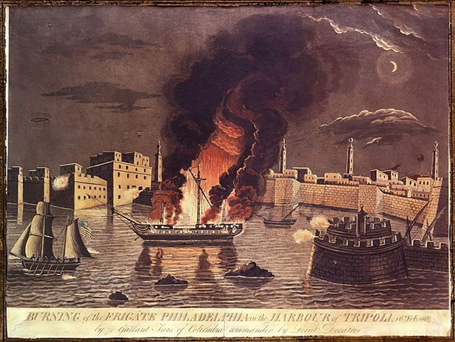 اعتبرت فيلادلفيا كجائزة كبيرة تقع في أيدي الليبيين في طرابلس، لذلك صدر القرار إما باستعادتها أو بتدميرها.في 19 فبراير 1804 قامت مجموعة أمريكية على متن المركب إنتربد “Intrepid” وهو مركب عسكري بصاريتين بالصعود ليلا إلى السفينة الراسية، حيث قاموا بإشعال النار في السفينة فيما اعتبره الأدميرال البريطاني هوراشيو نيلسون «أكثر الأعمال بطولية في العصر» حسب قوله.
