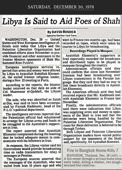 “وقال مسؤولون في الإدارة إنهم تمكنوا من التأكد من أنه منذ أواخر شهر نوفمبر كان الإيرانيون يبثّون باللغة الفارسية عبر محطات إرسال ليبية إلا أنهم أضافوا أنه لا توجد لديهم وسيلة لربط هذه البثوث مباشرة بآية الله الخميني.